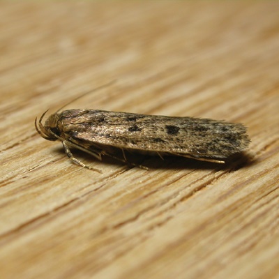 The related White Shouldered House Moth has mottled wings with a white head and “shoulders” where the wings join the body. Eggs are attached to fabric on which grubs will feed. The larvae are creamy-white caterpillars with brown heads.